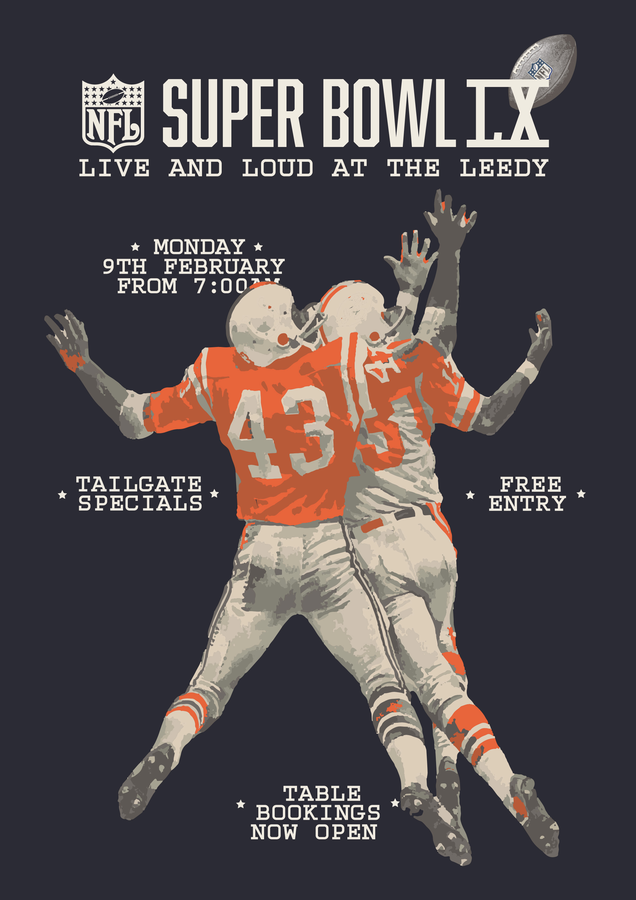 Join us bright and early in the Hotel for Super Bowl LIX, with doors opening at 7:00am in time for a 7:30am kickoff.